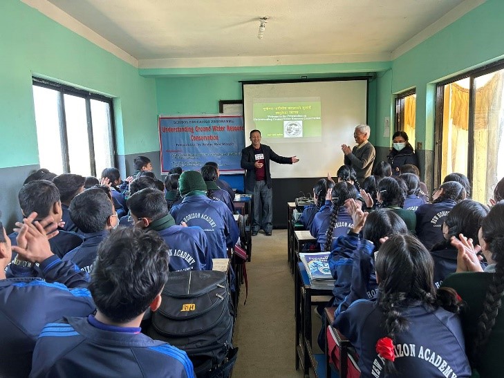 One hour class session was delivered on “Understanding Ground Water Resource Conservation” by Mr. Keshar Man Sthapit, President of the society and discussion was followed for half hour. The principal of the Academy, welcome and introduced to the students of grade 9 and 10 of the academy. There were 60 students attending the session. The session was attended by the principal as well as some class teachers. One note book and one dot pen were given to every student to take the note on the lesson. At the end of the session one packet of biscuit and soft drink was served to each to each student.